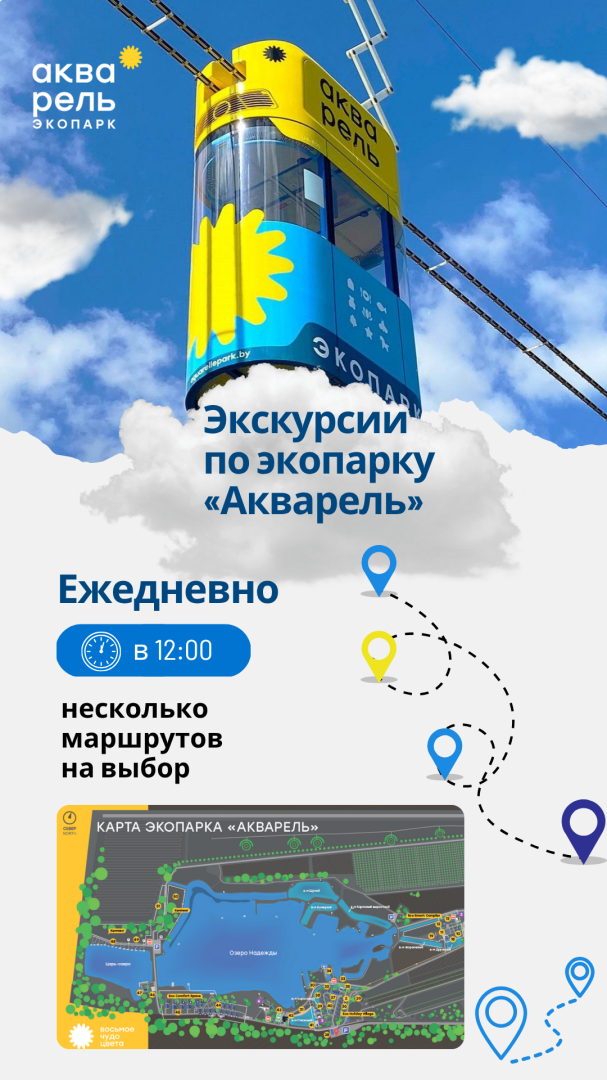 1. Акварель - восьмое чудо цвета - В рамках экскурсии вы посетите ЭкоТехнопарк и нулевой километр струнных дорог, узнаете почему конный клуб назывется Гриделия? Где находится кладовая здоровья? Познакомитесь с первым беспилотным комплексом «Юнилайт» и - узнаете, почему место садов на крыше! Увлекательная обзорная экскурсия, которая позволит вам ближе познакомиться с нашим крестьянско-фермерским хозяйством и узнать о применяемых методах и технологиях. Вы также посетите уникальные локации экопарка, доступ к которым недоступен для посетителей.